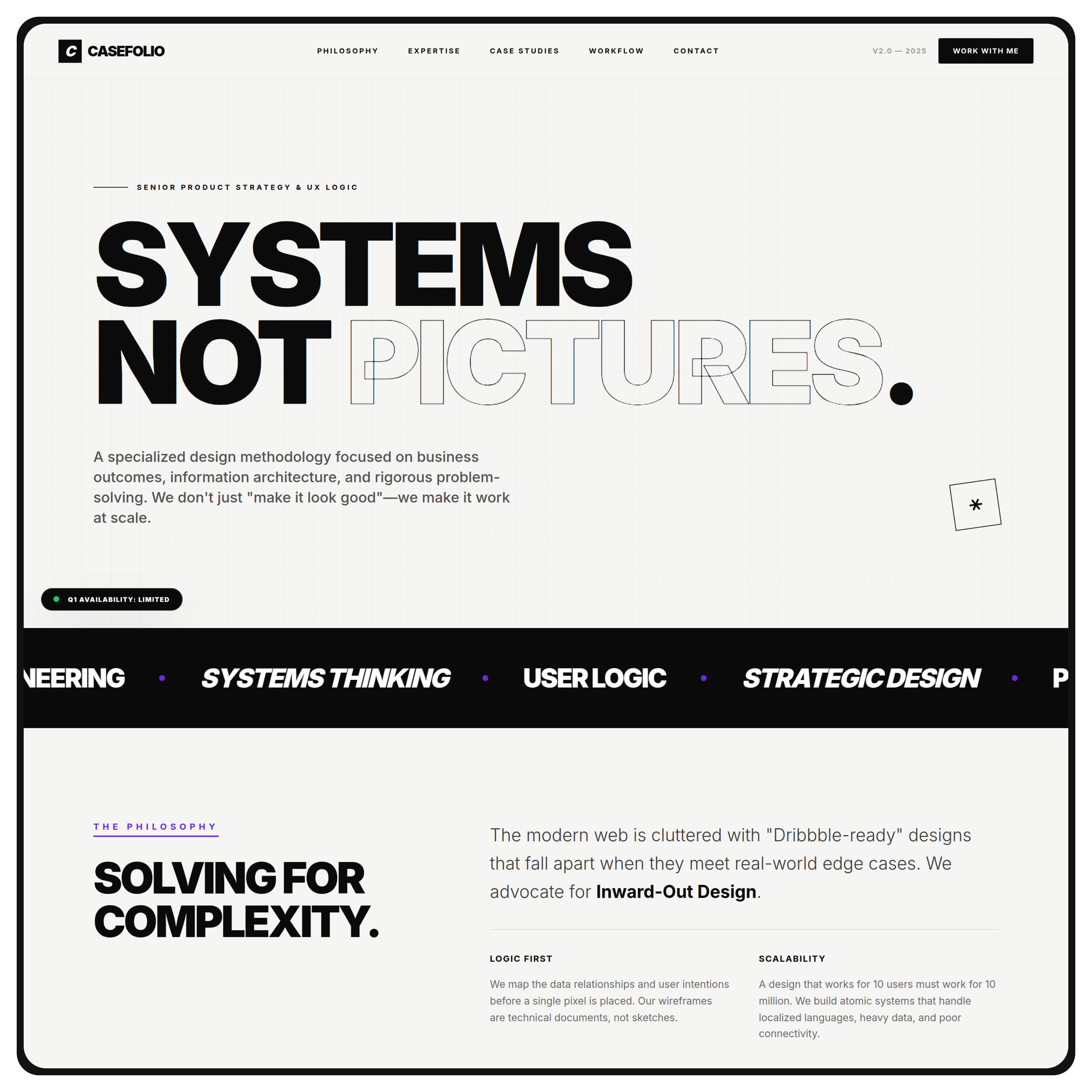 A strategy-first case study portfolio website template built for designers, product thinkers, and consultants who want to showcase how they think — not just what they designed. Casefolio focuses on problem framing, decision logic, systems thinking, and measurable outcomes. Instead of generic galleries, it uses editorial layouts, structured storytelling blocks, and credibility-driven sections to help you communicate impact, reasoning, and senior-level expertise. Ideal for attracting high-quality clients, recruiters, and founders who care about clarity and outcomes.