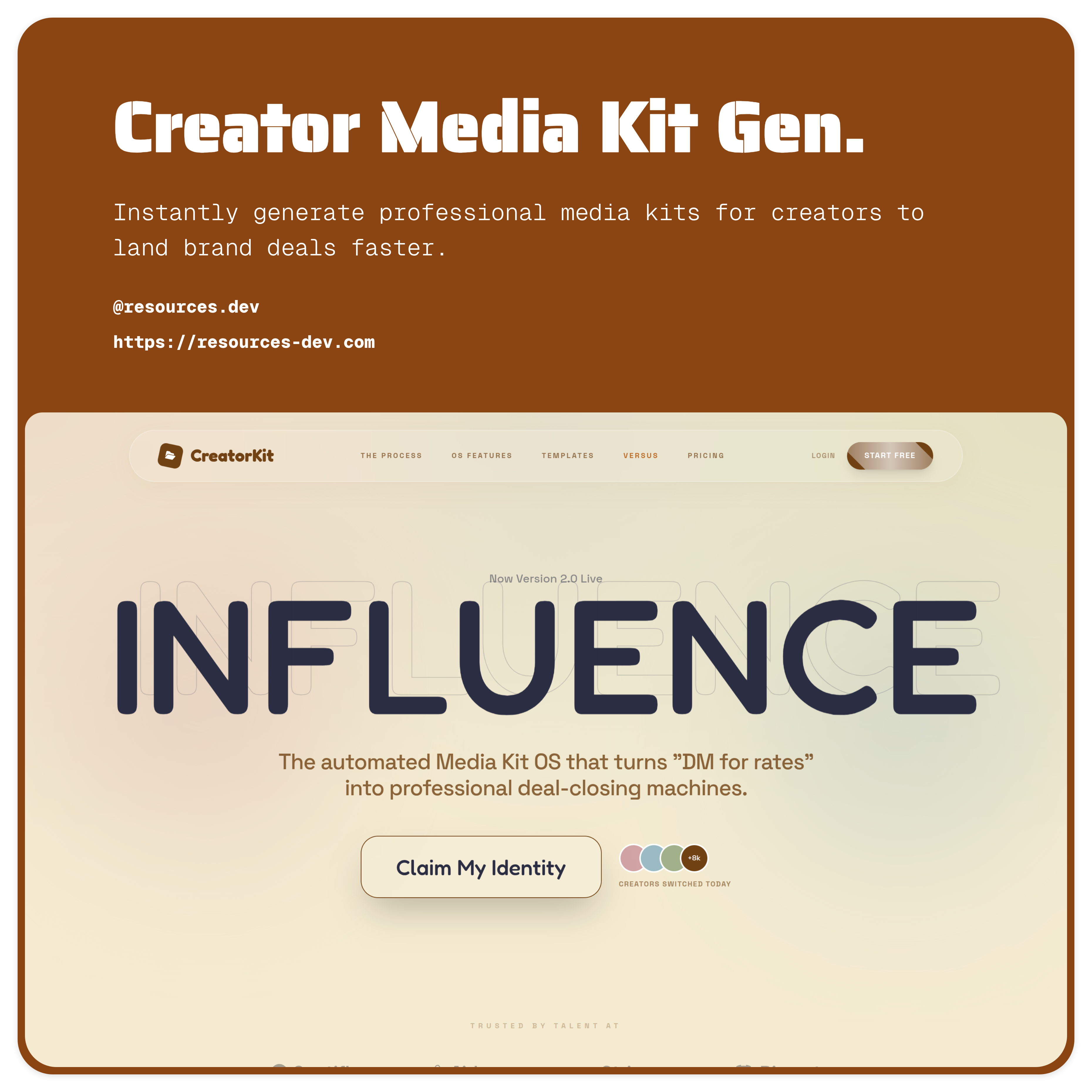 A creator-first landing page template designed to sell media kit generators, creator SaaS products, and brand deal tools. Focused on trust, analytics presentation, and professional positioning for creators.