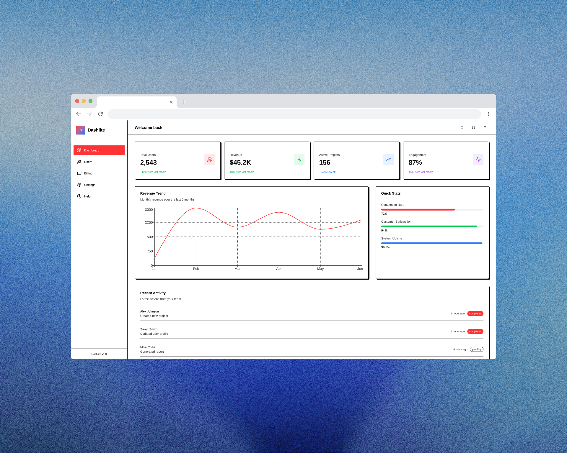 Dashlite is a frontend-only dashboard UI template designed for SaaS startups and internal tools. Built using Next.js, Tailwind CSS, and shadcn/ui, it provides all the pages you need for an admin dashboard — fully static and ready to connect to your API.
