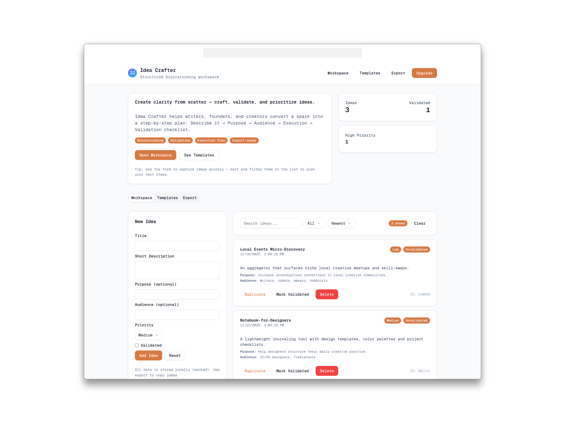 Idea Crafter is a clean, functional, and production-ready Startup Idea Manager web application built with Next.js, Tailwind CSS, shadcn/ui, and fully interactive client components. Perfect for indie hackers, founders, and developers who want a real working web app template — not just a landing page.