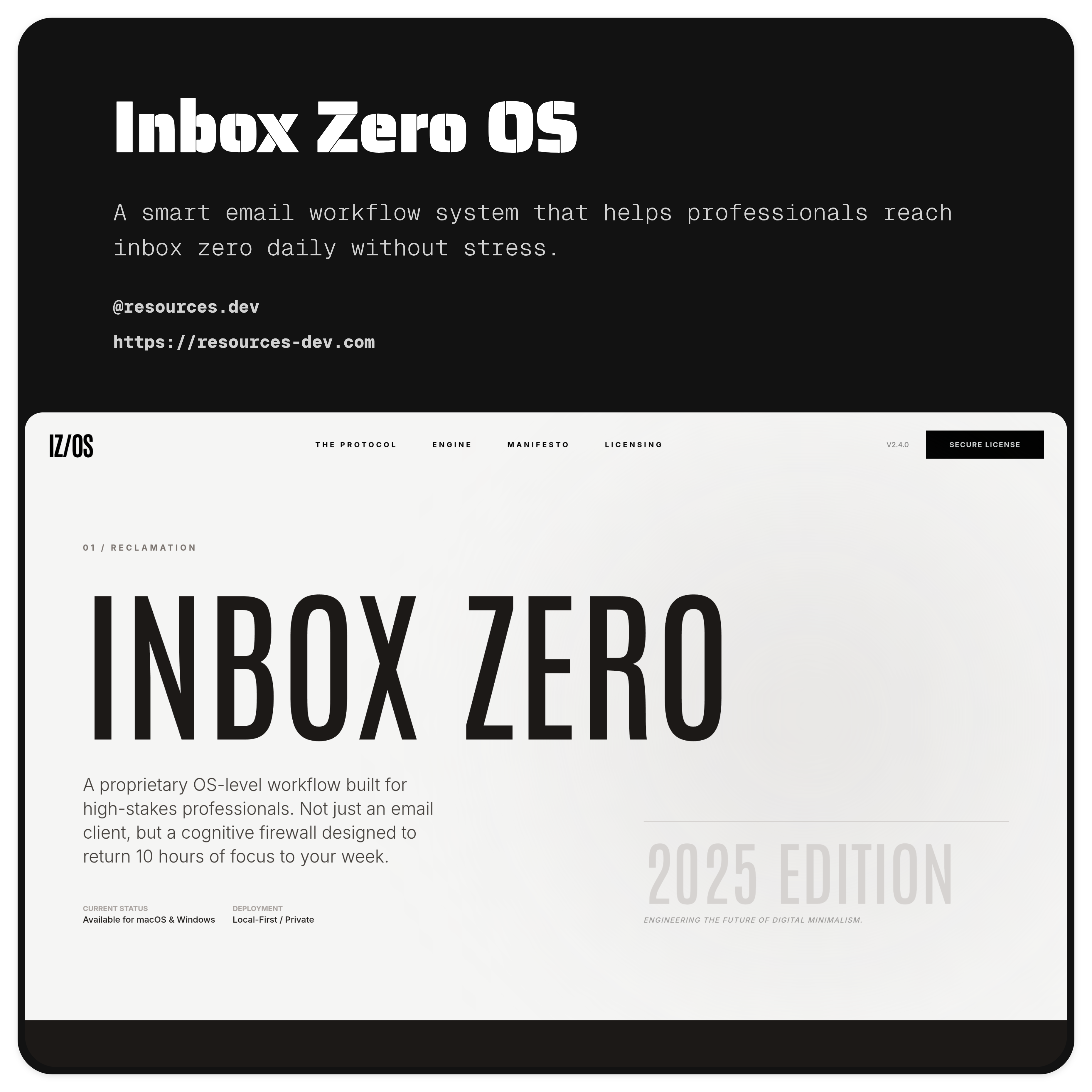 A high-end productivity landing page template designed to sell focus, clarity, and time control. Built for email tools, workflow systems, and founder OS products with strong editorial hierarchy and enterprise-grade visuals.