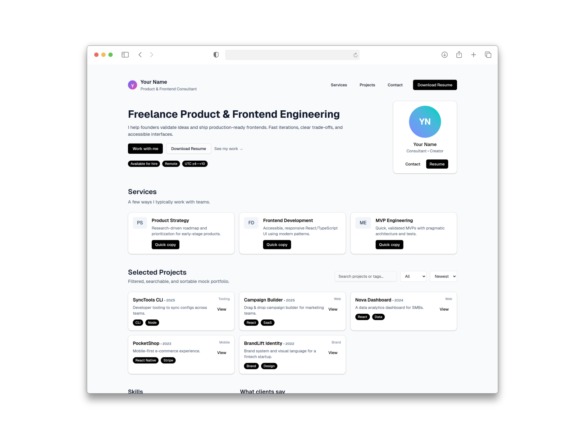 A clean, modern, production-ready portfolio website template built with Next.js, shadcn/ui, and Tailwind CSS. Includes portfolio filtering, services overview, testimonials carousel, skills, full contact form, and resume download. Perfect for freelancers, developers, designers, or consultants who want a polished, professional site.