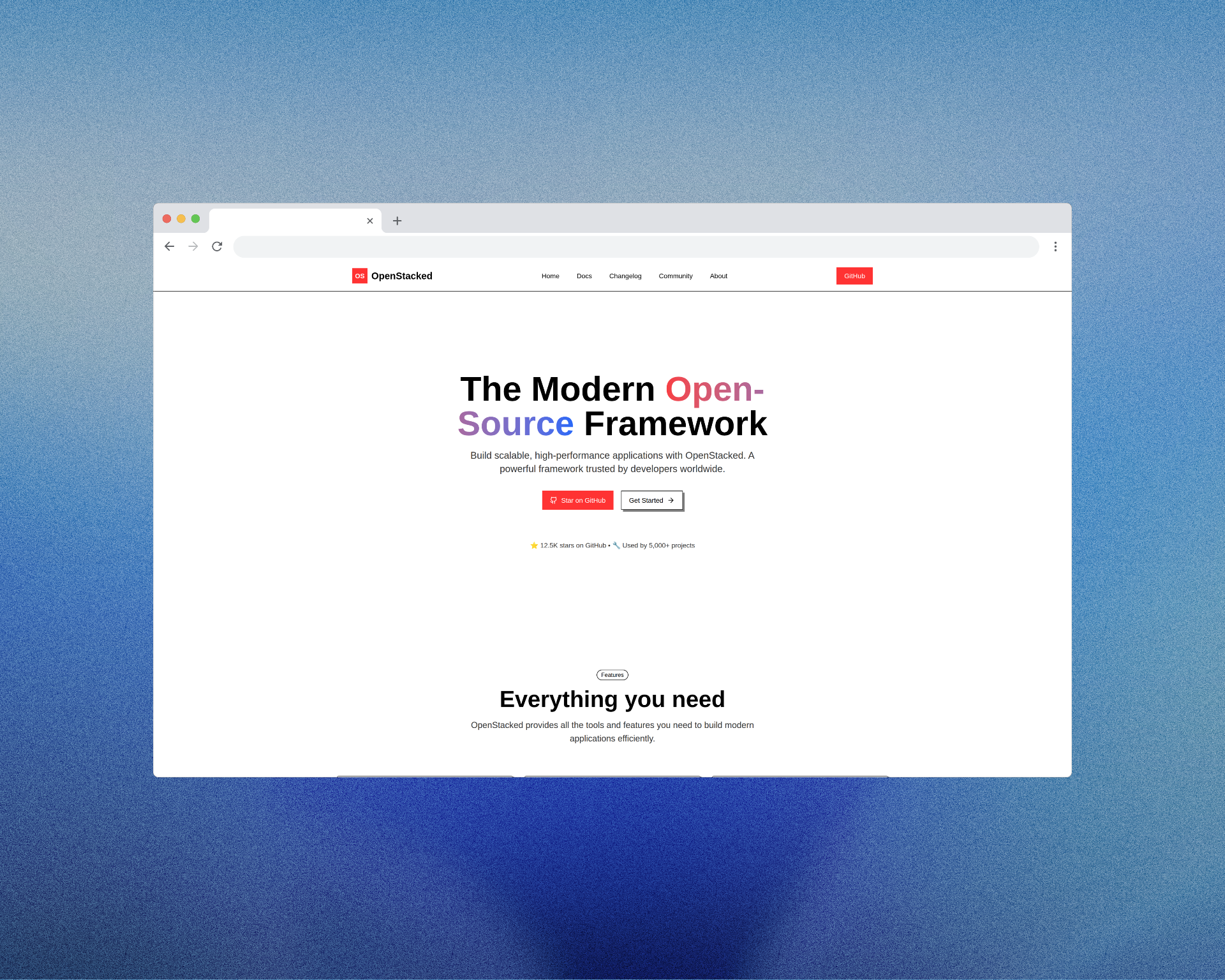 OpenStacked makes it easy to promote your open-source project with style. A static, multi-page site built with Next.js 14, Tailwind CSS, and shadcn/ui — perfect for GitHub projects, developer tools, or CLI apps.
