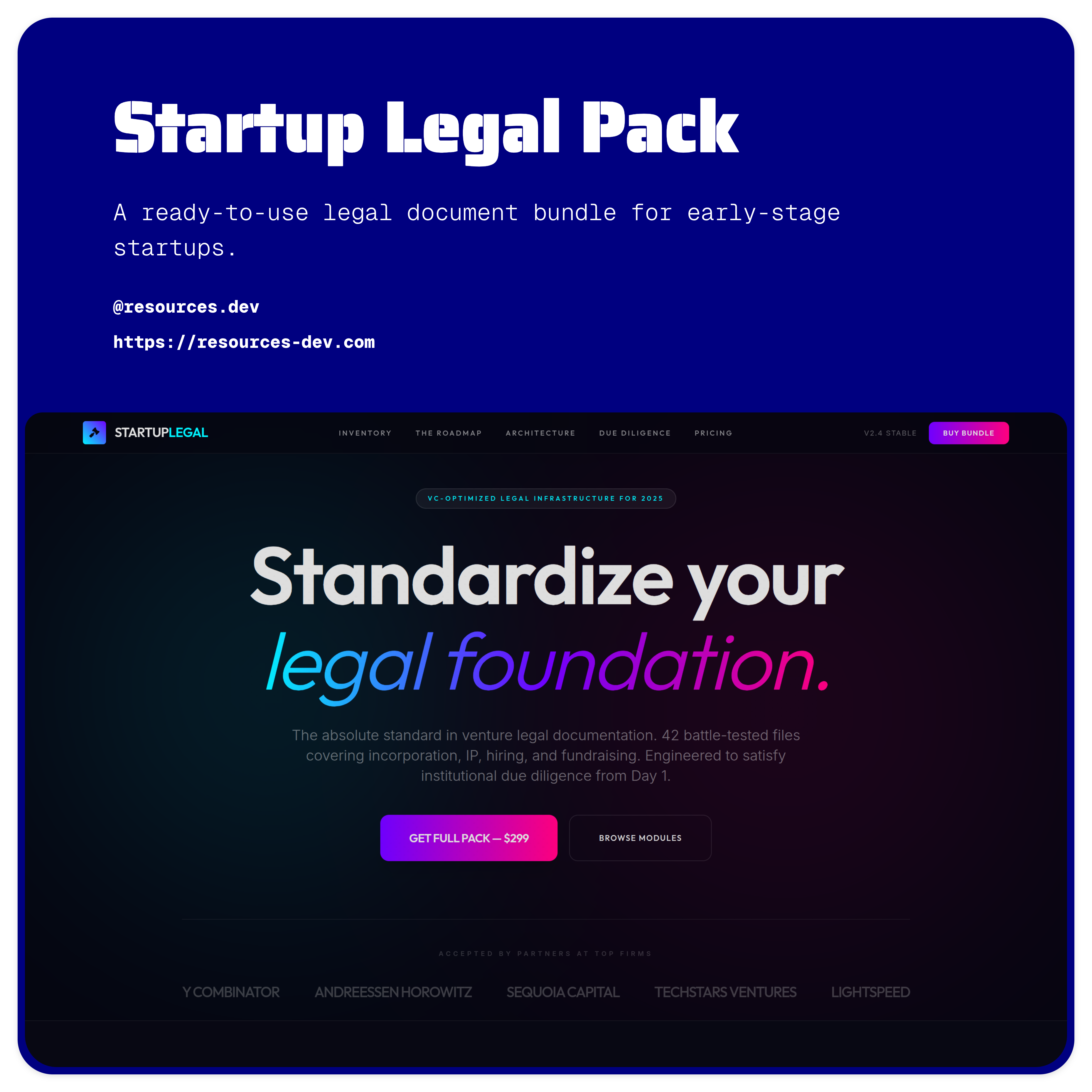 A premium startup-focused website template built to sell legal document bundles, founder toolkits, and compliance products with VC-grade credibility. Designed to communicate trust, standardization, and seriousness for startup legal offerings.