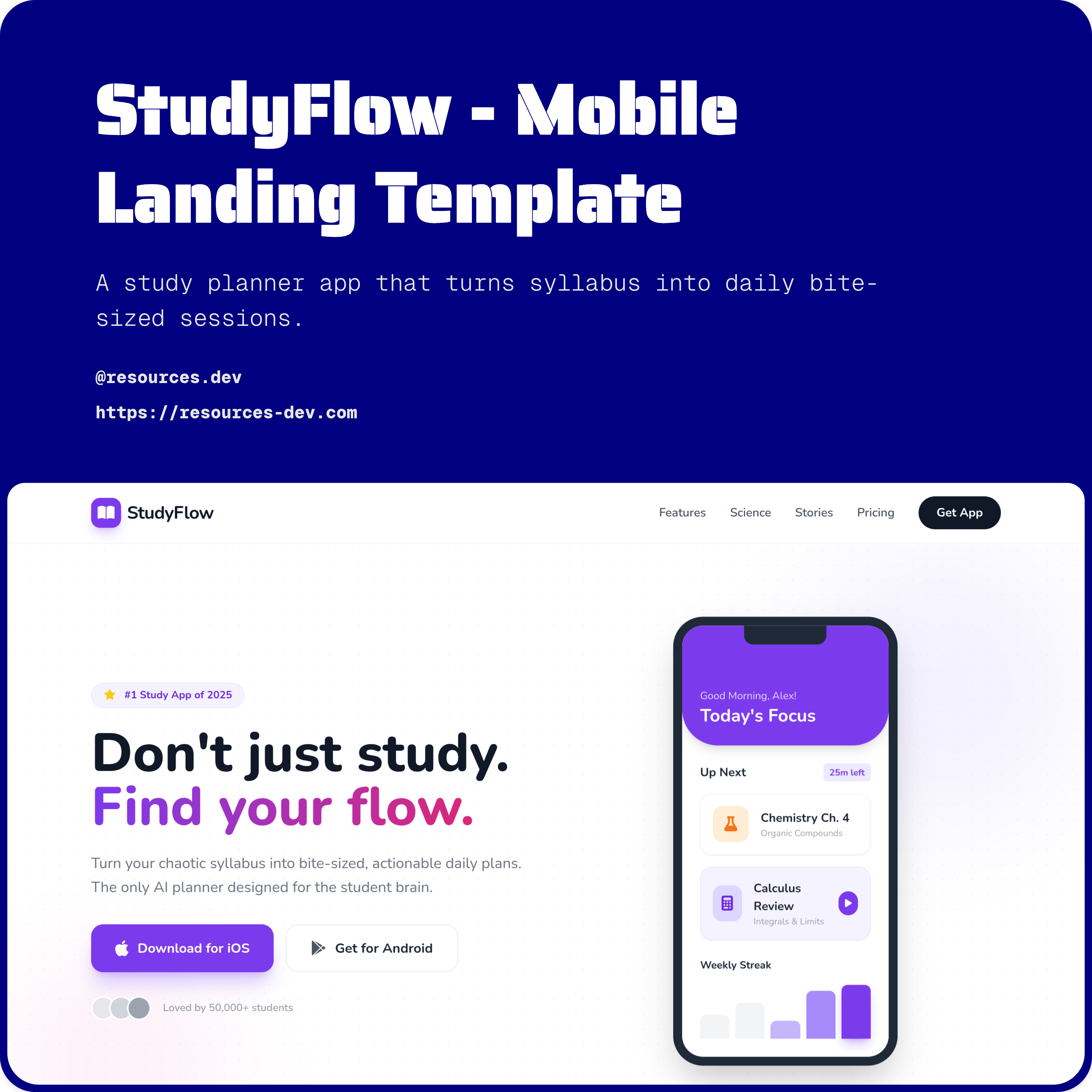 A student-first landing page template built for study planners, learning apps, and ed-tech products. Features a friendly UI, progress visuals, testimonials, and clear value messaging tailored to student audiences.