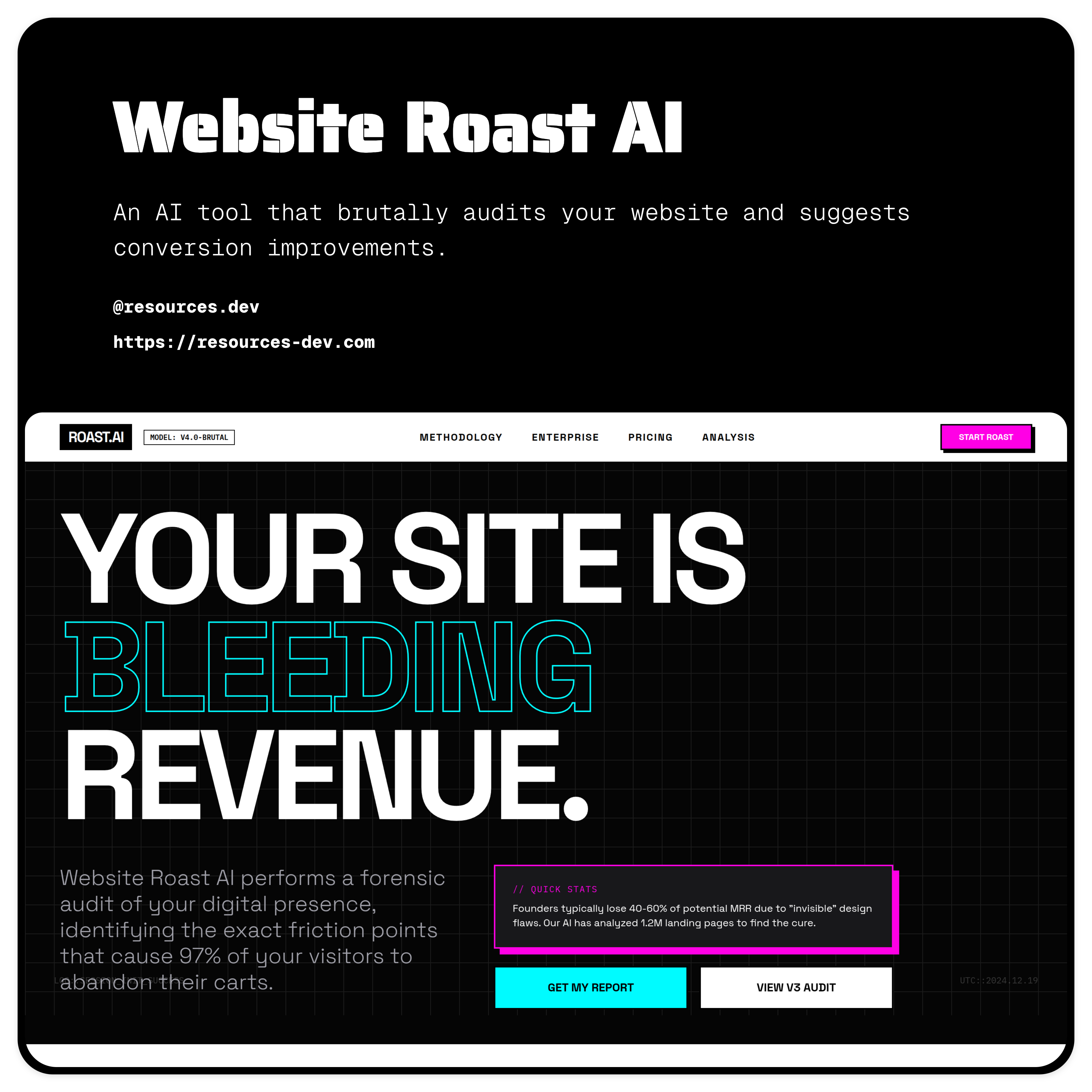 A brutal, conversion-focused website template designed to sell website audits, CRO services, AI reports, and teardowns. Built with high-contrast layouts, strong authority positioning, and clear audit methodology sections.